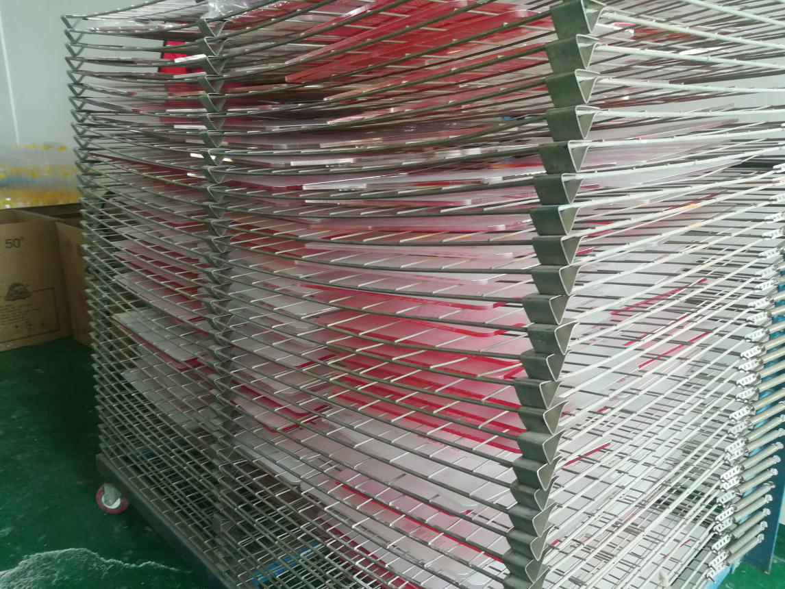 將透明的亞克力板按照尺寸切割完成后,通過絲印技術(shù)印上定制的圖案、LOGO。下圖是亞克力標牌絲印完成后放置晾干。